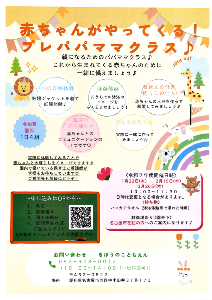 きぼうのこどもえんでは、初めての出産を控えたご夫婦・カップルを対象に、楽しく学べる「プレパパママクラス」を開催します!