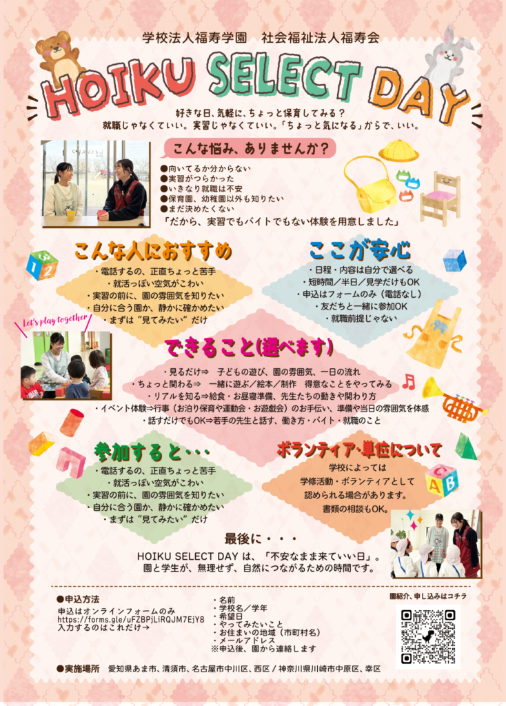 HOIKU SELECT DAYは、「不安なまま来ていい日」。 園と学生が、無理せず、自然につながるための時間です。